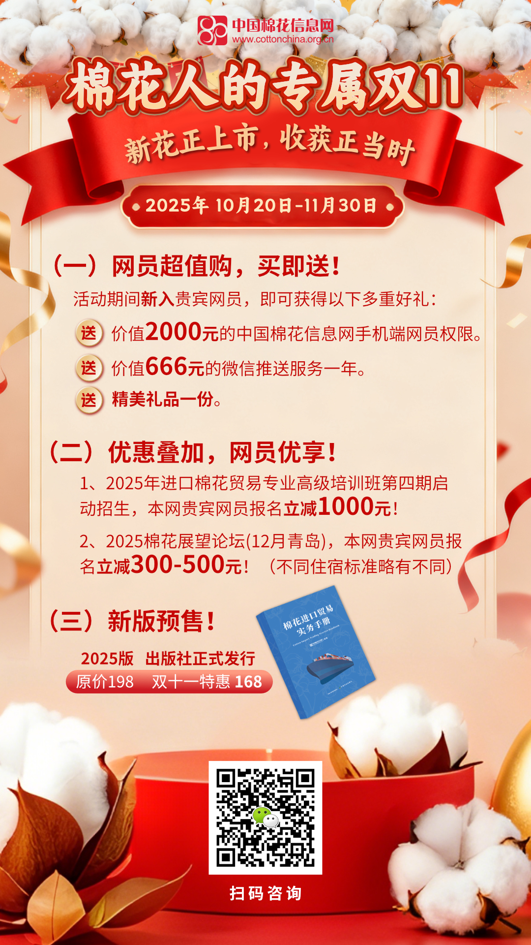 此外,中国棉花信息网推出棉花人的专属双11优惠活动!扫描下方海报二维码咨询活动详情~