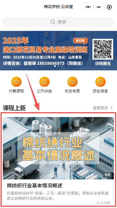 上新啦!上新啦!“棉花学校·云讲堂”小程序这次给各位带来的课程是《棉纺织行业基本情况概述》,欢迎大家在微信搜索“棉花云讲堂”免费试听课程。