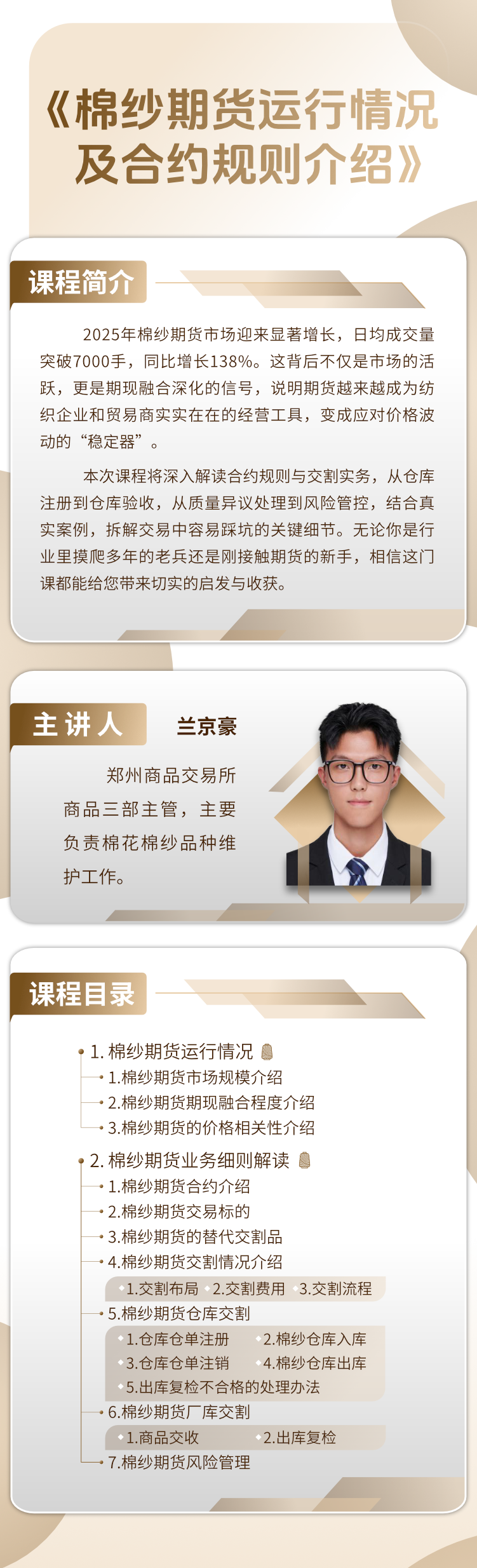 《棉纱期货运行情况及合约规则介绍》课程给你答案。这门课程不是简单地讲“纸面规定”,而是深入解读合约规则与交割实务,从仓库注册到仓库验收,从质量异议处理到风险管控,结合真实案例,拆解交易中容易踩坑的关键细节。无论您是行业里摸爬多年的老兵还是刚接触期货的新手,都能给您带来切实的启发与收获。欢迎大家在微信搜索“棉花云讲堂”免费学习课程。